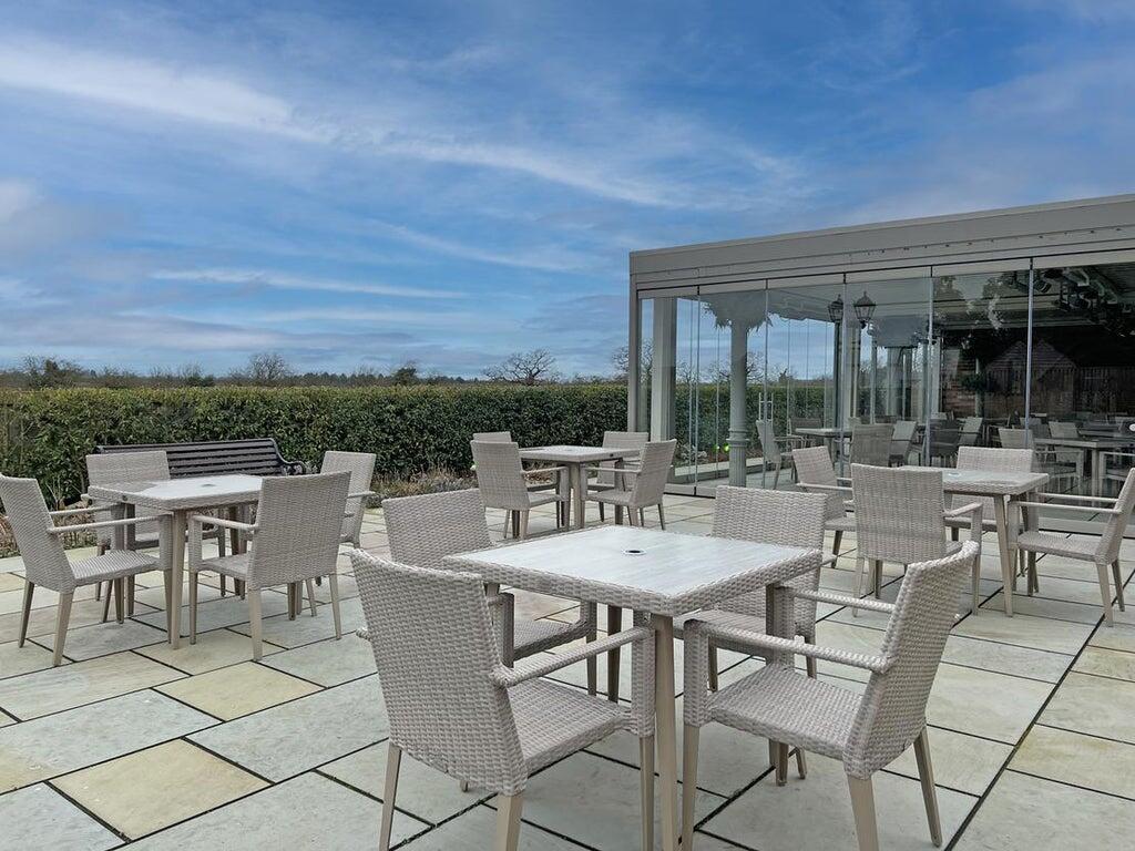 Dining restaurant (100) with centrally located oak bar servery, free-standing oak tables & chairs, beamed vaulted ceiling, feature exposed brick walls, full height retractable oak doors to the Mediterranean style dining conservatory (60) with quality all weather table & chairs.