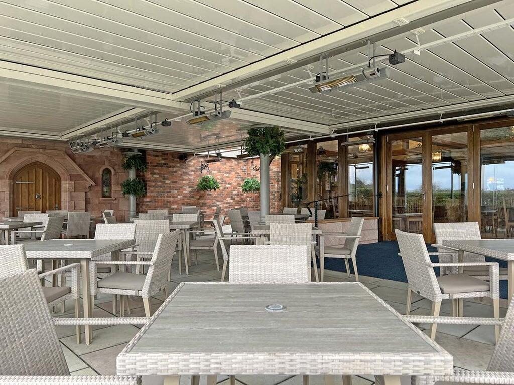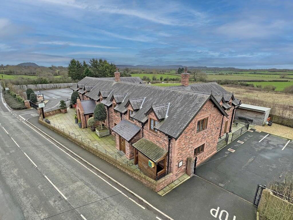 An impressive two storey detached inn of reclaimed Cheshire brick elevations beneath a pitched tiled roofline, with large two storey extensions to rear, incorporating 2 self-contained owner's apartments, and the impressive Mediterranean style dining conservatory covered by a fully retractable and automated roof.