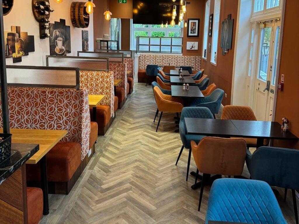 The modern and spacious dining area is to the left as you enter comfortably accommodating for around 44 seated via a mixture of moveable tables and chairs with fixed booths to the right. The room is decorated to a high standard with hanging wall art and warm colours.