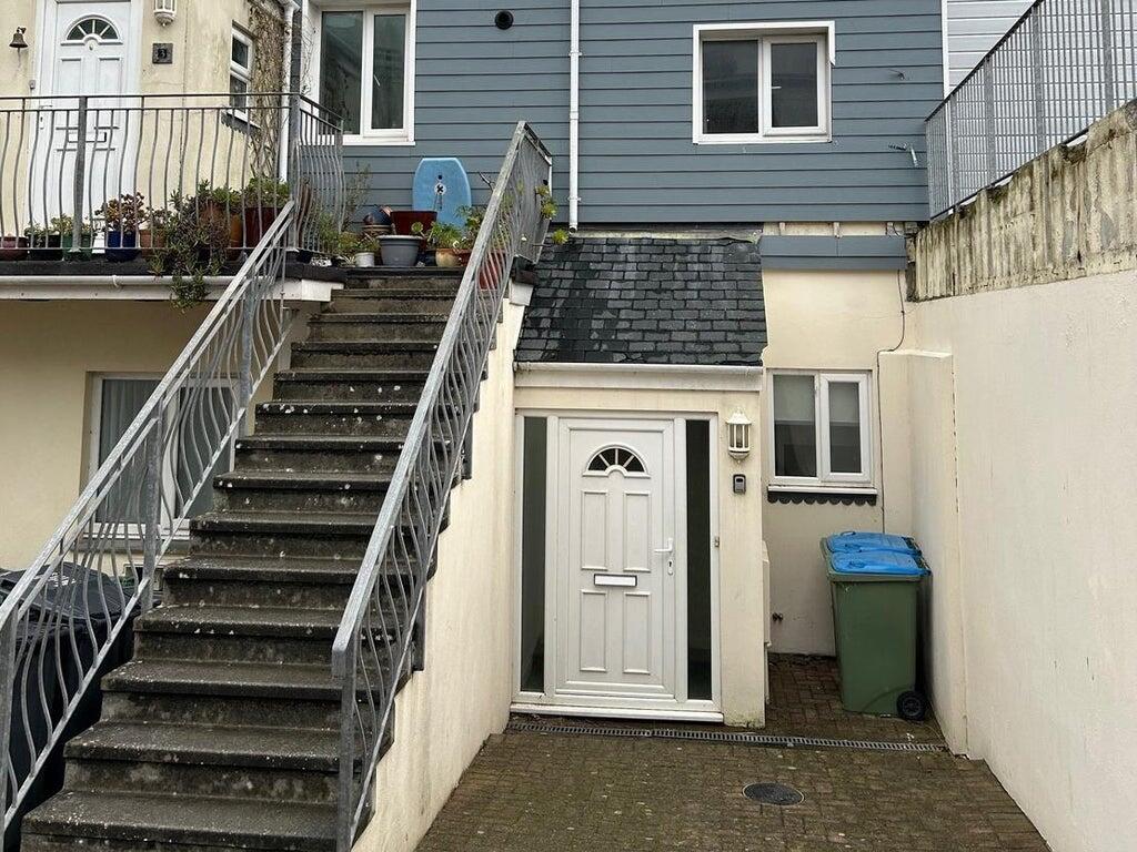 The property is set back from Fore Street and comprises a three-storey end of terrace building made of brick, featuring a pitched tiled roof. It has part-coloured weatherboard and stone elevations, along with a single-storey addition to the front and dormer windows.