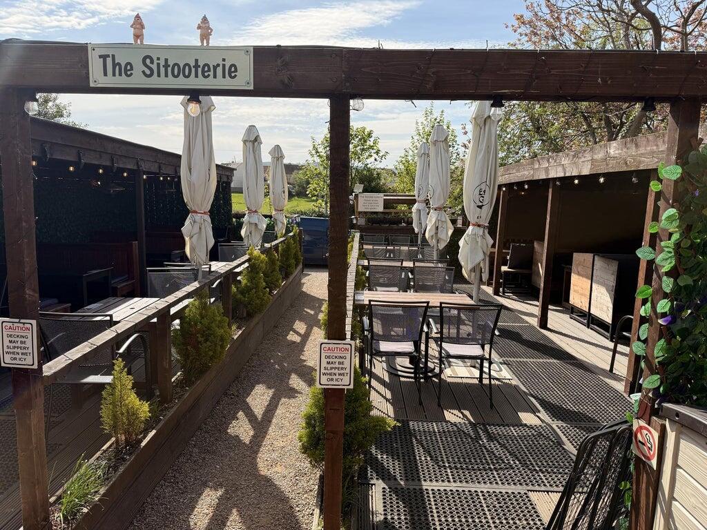 External DetailsA charming beer garden named "The Sitooterie" complete with its own outside bar and a decked area split over two sides. There are a mixture of covered booths equipped with heaters, bench seating and loose tables and chairs with a capacity of c.80.