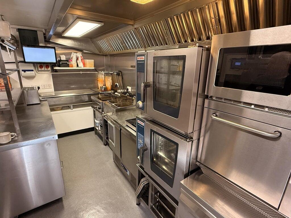 The basement level features a spacious commercial kitchen equipped with a separate store and additional external storage facilities.
