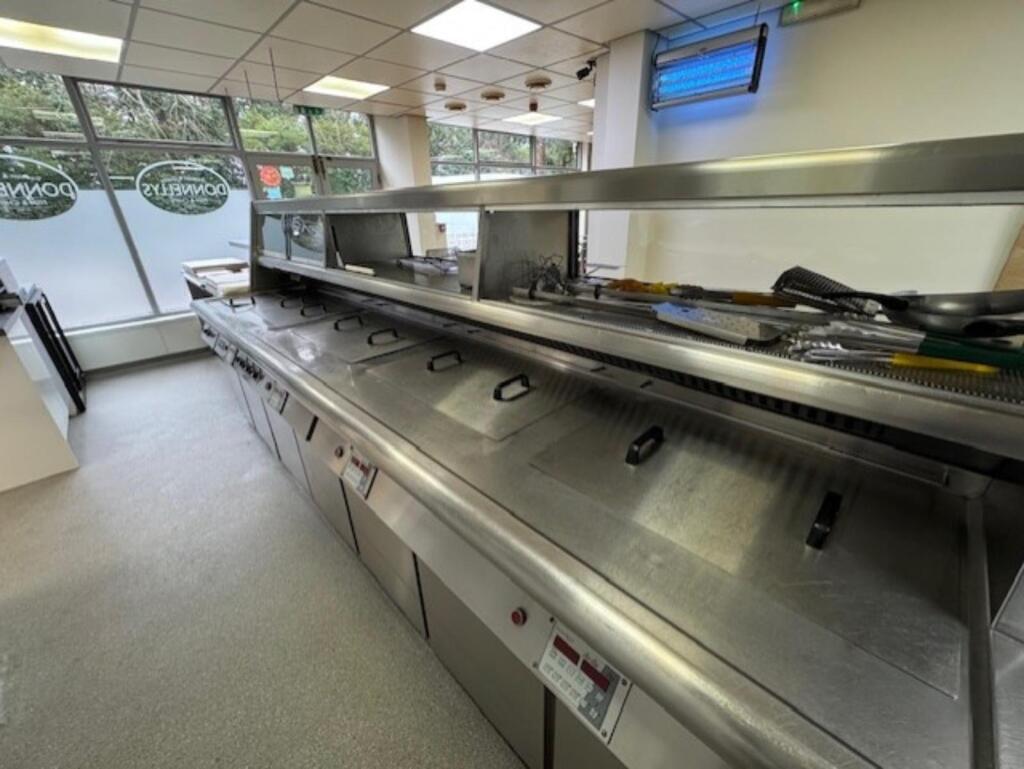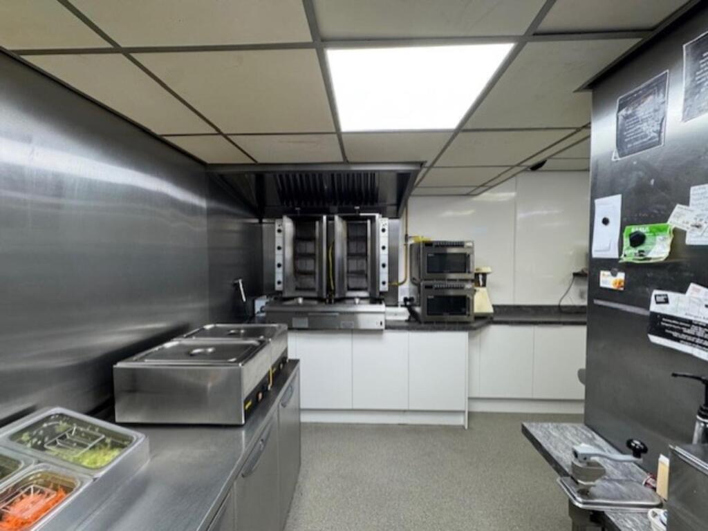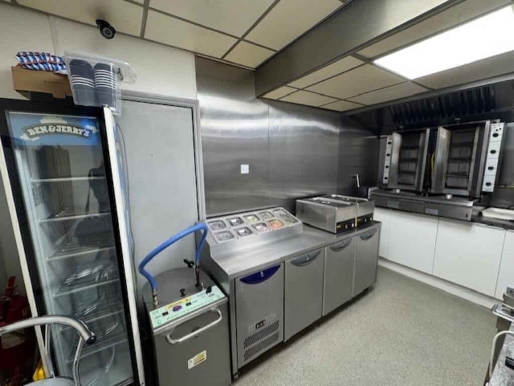Takeaway comprising: tables and chairs to cover (8), stainless steel serve over sales counter, 4 pan range (Hewigo) with chip box and 3 x warming cabinets, insect zapper, worktop with 2 base units, EPOS till system, undercounter 2 door drinks fridge (Coca-Cola), 3 x wall mounted menu boards, stainless steel wash basin, wall mounted soap dispenser, wall mounted paper towel dispenser, batter mixer (Bold), 2 x commercial microwaves (Samsung), dual kebab machine (Archway), kebab meat shaver, 2 x kebab meat catchers, extraction canopy, 4 x wet bain-marie’s (Buffalo), worktop with commercial can opener, 2 x base units, CCTV monitor (6 camera system), slimline ice cream fridge (Ben & Jerry’s), fat filtration machine, saladette with 4 x stainless steel undercounter fridges, worktop with eight base units and a knife sharpener (Salter).