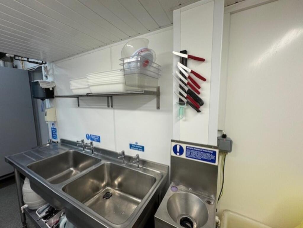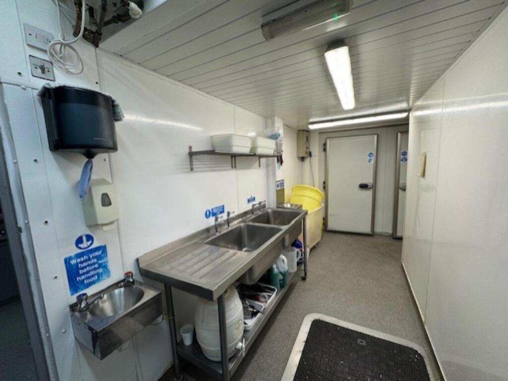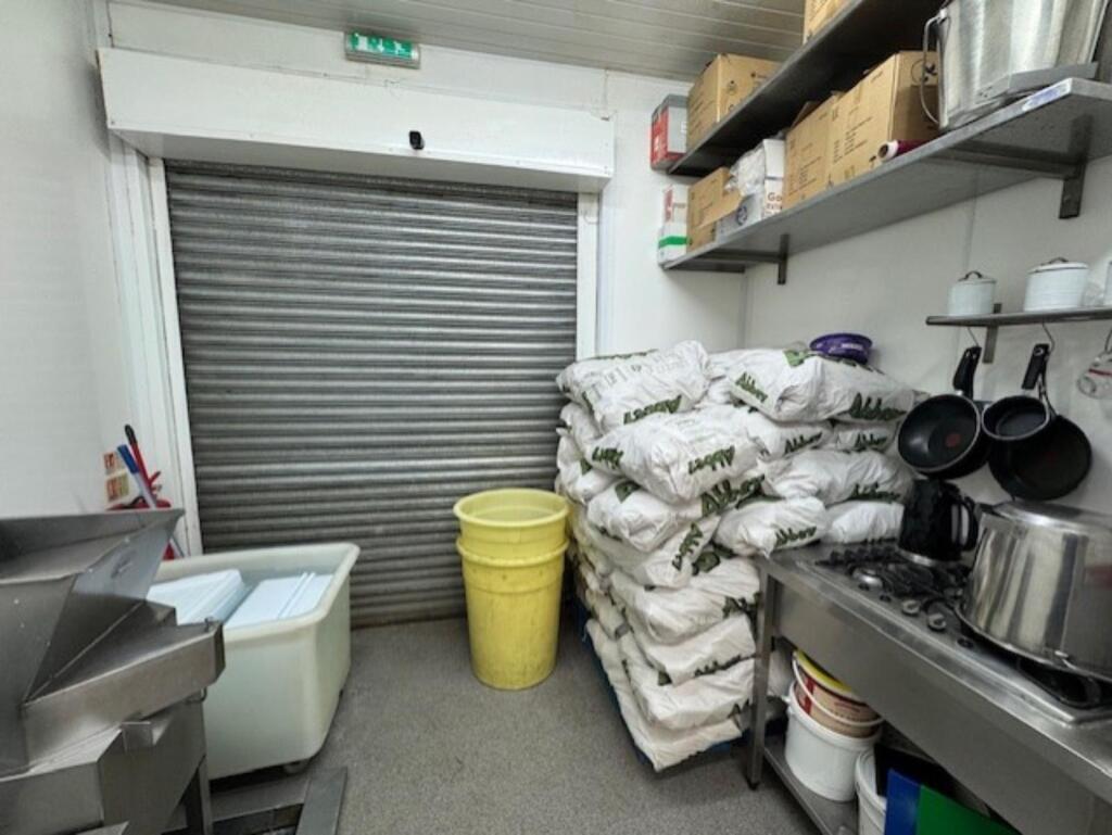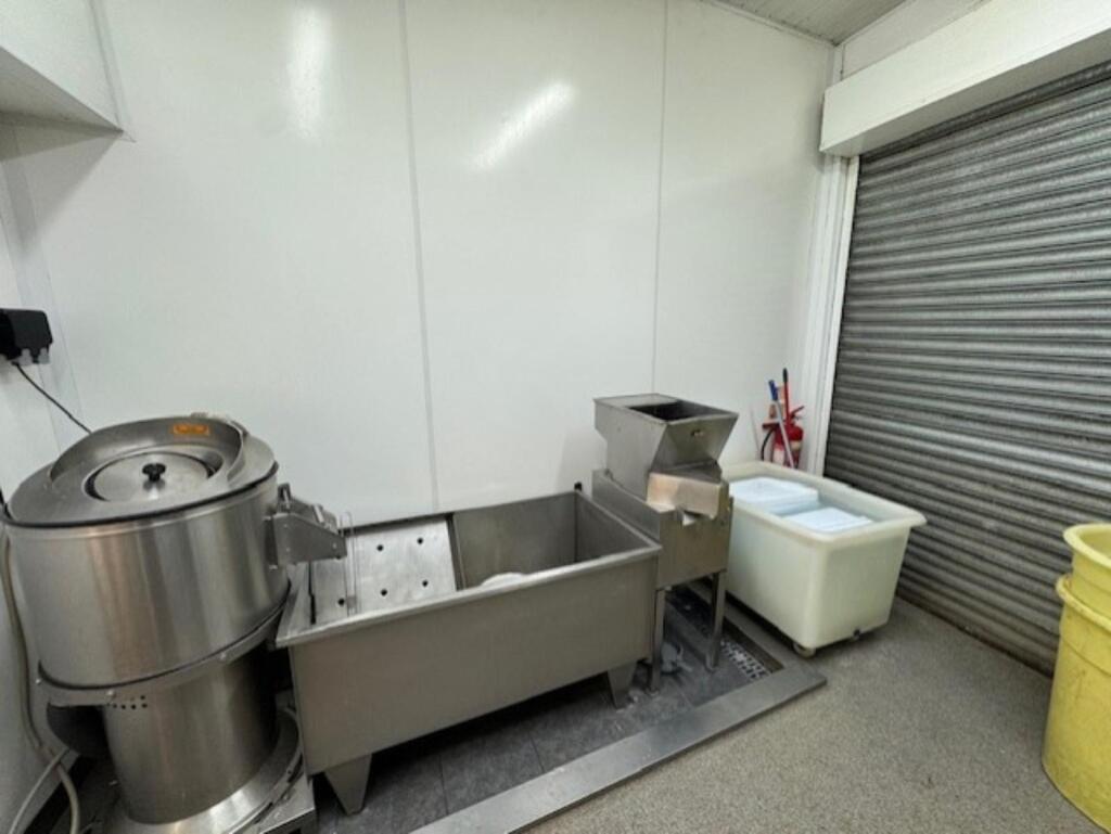 Prep room with potato storage area, 5 burner gas hob, 3 x wall mounted metal storage racks, 2 x wall mounted metal shelves, potato chipper (Bold), potato peeler (Bold), 2 x plastic chip bins, stainless steel potato soak tank, two portable plastic chip bins, insect zapper, stainless steel wash basin, wall mounted soap dispenser, wall mounted paper towel dispenser, dual stainless steel sink drainer, stainless steel food macerator, walk-in cold room with 2 x storage units, walk-in freezer with 2 x storage units, electric internal shutters to the frontage and commercial water heater (Rinnai).