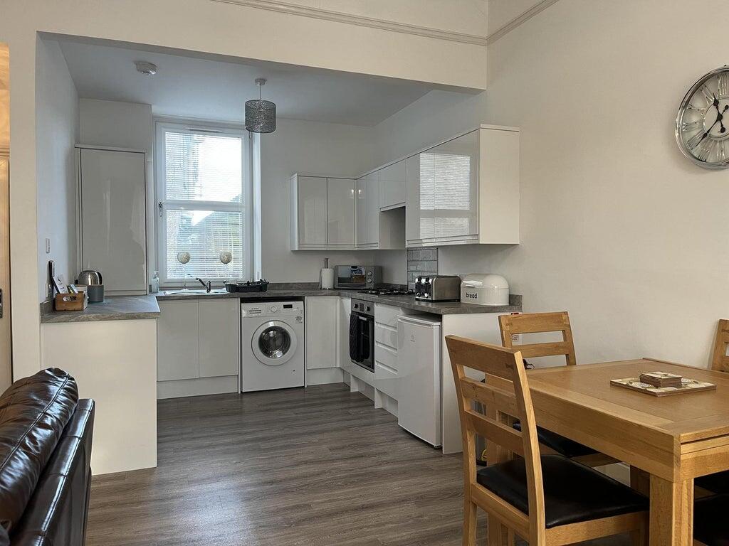 The lounge is spacious and welcoming with modern sofas, simple décor and tall windows that let in plenty of natural light. The bedroom is generous in size, attractively finished with soft furnishings and a calm, relaxed feel. A modern fitted kitchen and dining area is laid out neatly, offering practical storage and space for everyday living.