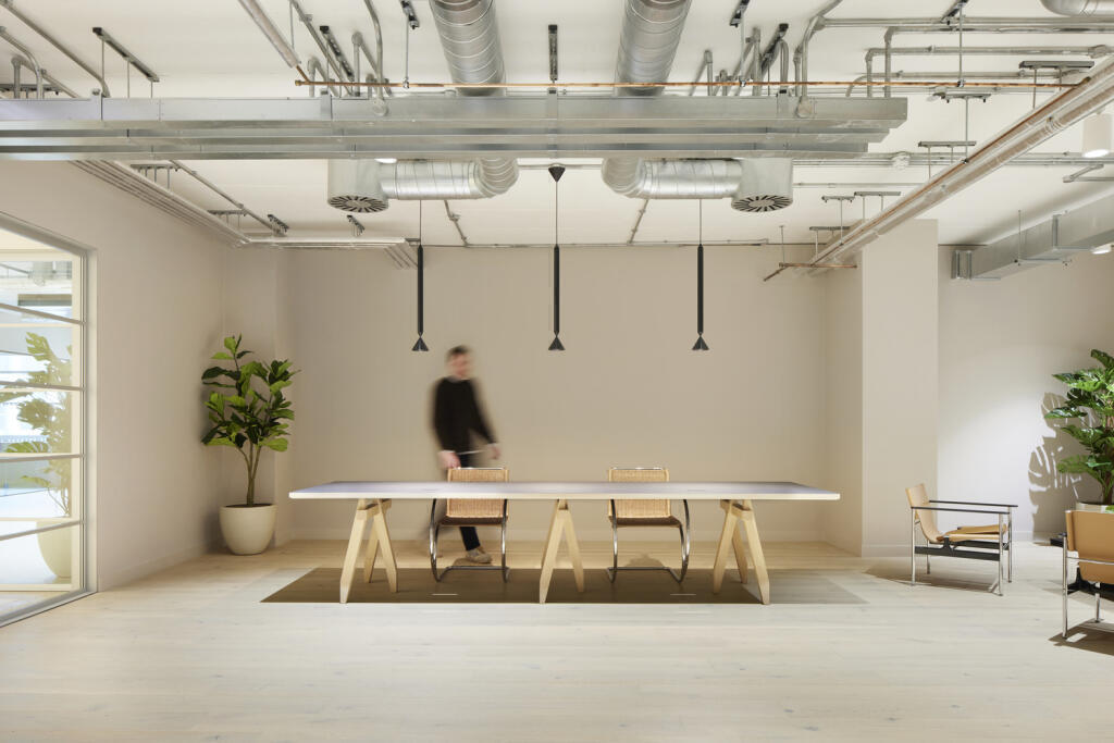 The outdoor courtyard has been thoughtfully designed with generous seating areas and mature greenery, providing a peaceful setting for breaks or informal meetings. Inside, glazed sliding doors lead to a bright, contemporary reception space, featuring high-quality finishes such as end-grain timber flooring and bespoke feature lighting, creating an inspiring first impression for staff and visitors alike.