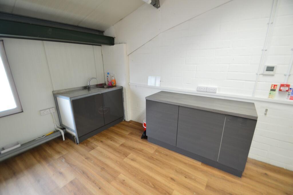 Being a mid terrace premises, the unit is of steel portal frame construction under a profiled insulated roof with approximately 10% translucent roof panels. There is brick work to the exterior of the premises to approximately 7ft with all internal elevations being block work. The ground floor provides a floor area of 776 sq.ft (72 sq.m) which currently has a false ceiling with recessed strip lighting, head height of 10`0 (3.05m). There is a full coverage mezzanine floor of 650 sq.ft (60 sq.m) with double glazed windows front and rear facing. Additional specification includes electric roller shutter door, glazed double door entrance, personnel access door, Three Phase electricity, toilet and kitchenette with twin base units.