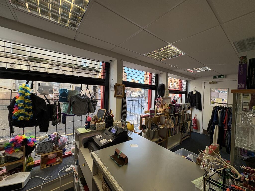 The premises are on the ground floor of a traditional red sandstone tenement building. It has shop frontage on both Tollcross Rd and Burgher St elevations. The shop has a large front sales area and a small back store with tea prep area. There is a toilet to the rear. It has an aluminium framed front door and glazed display window with electric internal and external shutters. It was previously a charity shop.