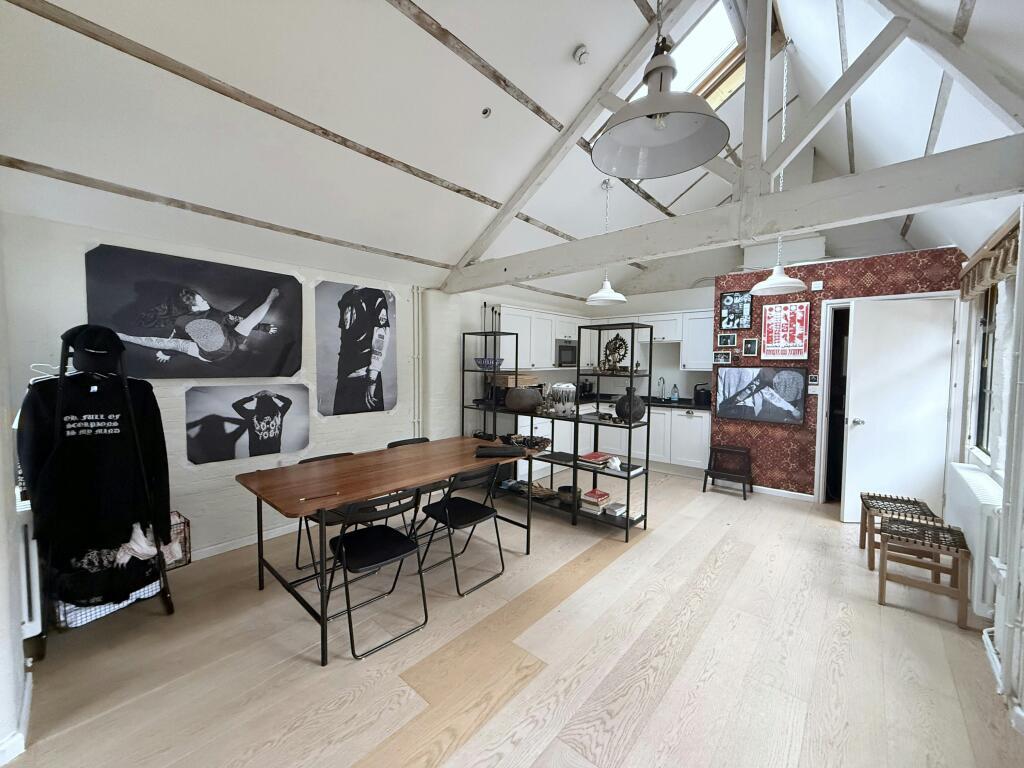 A first-floor studio within a beautifully restored former warehouse, finished to an exceptional standard throughout. New timber flooring is flooded with natural light from pitched-roof skylights and large windows on three elevations, while reclaimed pendant lighting suspended from the apex creates a striking and inspiring workspace.