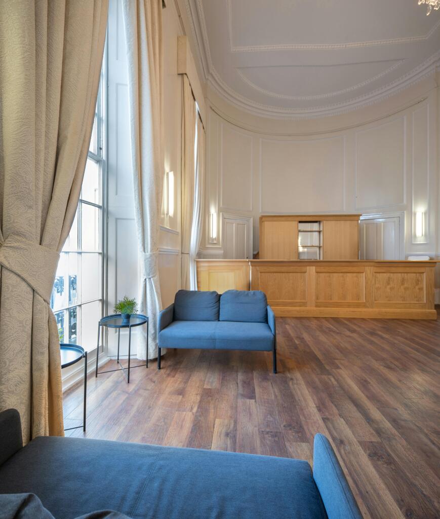 and a corniced, painted ceiling. A series of service