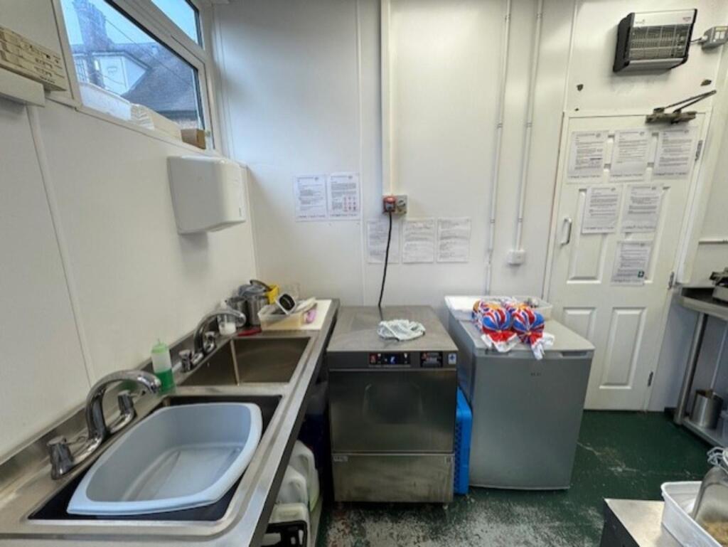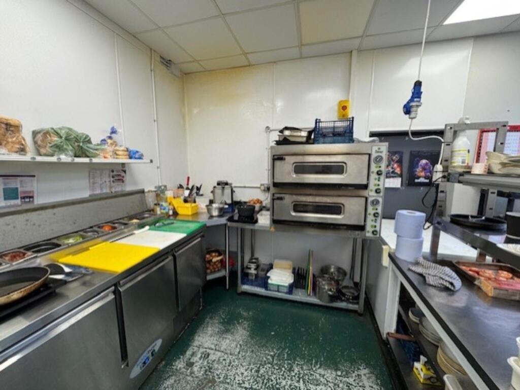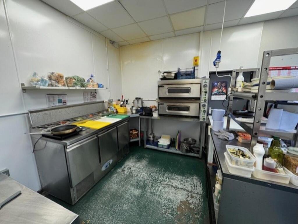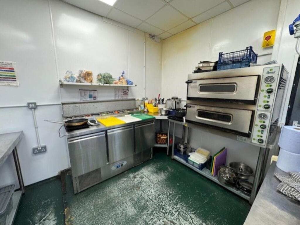 Kitchen comprising: stainless steel table with commercial can opener, stainless steel corner table, 3 x induction hobs (Daewoo ), 2 deck electric pizza oven (Fimar ), panini press (Milantoast), stainless steel table with double heated pass, extraction canopy, storage unit, stainless steel dual sink, dishwasher (Sammic ), undercounter freezer (Wan), commercial water heater (Ariston), chest freezer, insect zapper, refuse bin, storage cupboard and rear exit door.