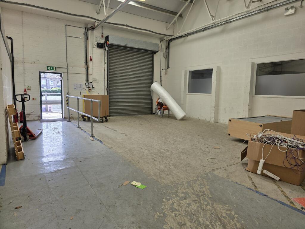 A mid-terrace warehouse with roller shutter vehicle access/loading to the rear and WC facilities.