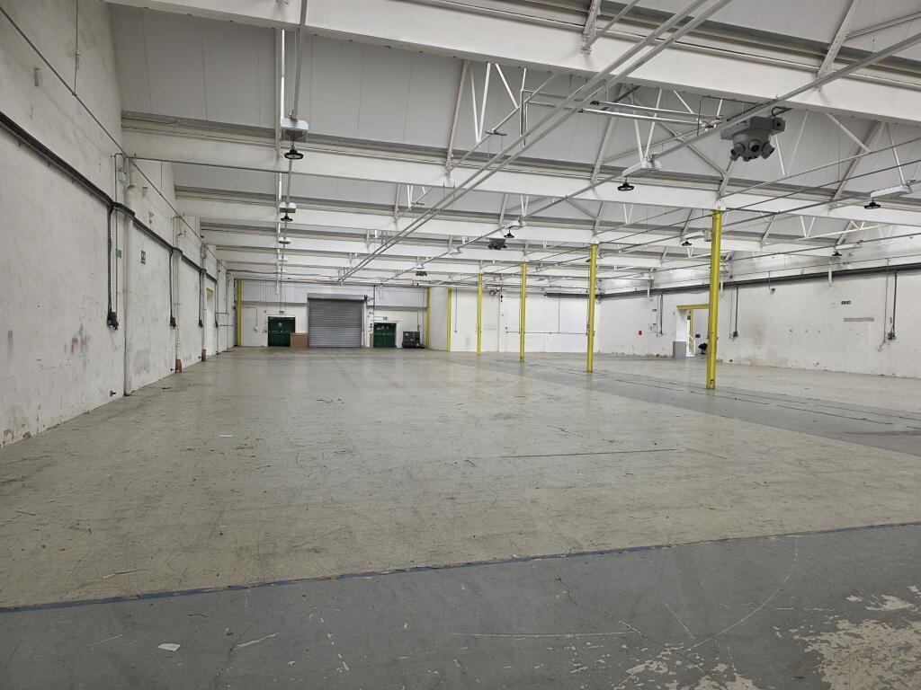A mid-terrace large open plan warehouse with loading bay to the front and roller shutter vehicle access to the rear.