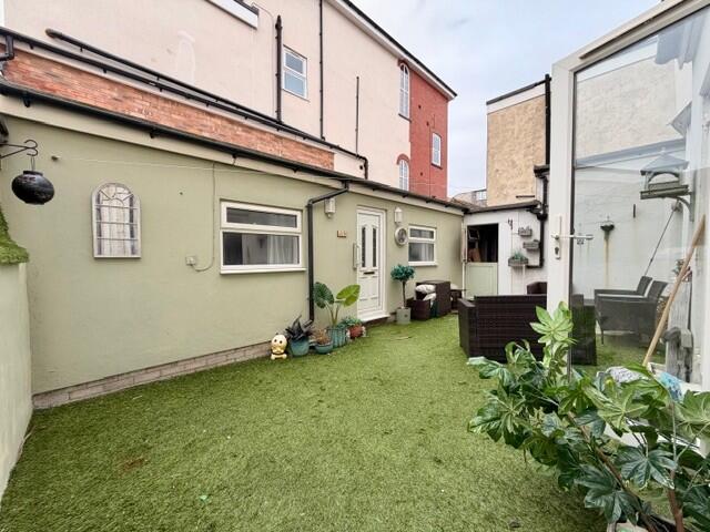 EXTERIOR; Garden to the front of the property with artificial grass. Secluded garden area to the rear with seating for 8 guests.