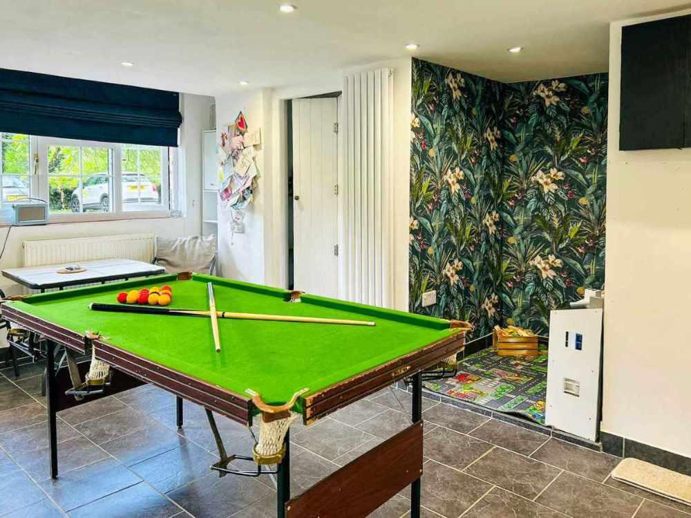 A great space adjacent to the kitchen with its own front door, pool table, cloakroom, and door to