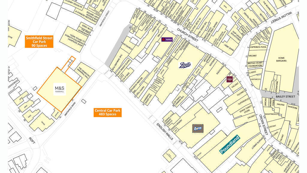 The property is a purpose built foodstore comprising an M&S foodhall with bakery and click and collect on the ground floor and ancillary accommodation on the first floor. The store has a main customer entrance on Smithfield Street and a secondary access to the rear leading to Smithfield Street car park. The store is serviced through a service yard to the side of the property.