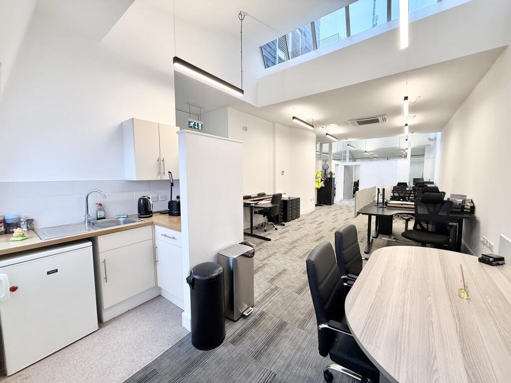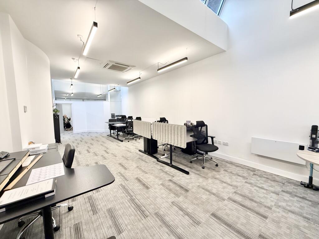 The suite benefits from strong natural light, modern lighting, air conditioning and a fitted kitchenette. The layout supports open-plan working alongside meeting or breakout space, offering flexibility for evolving business requirements.