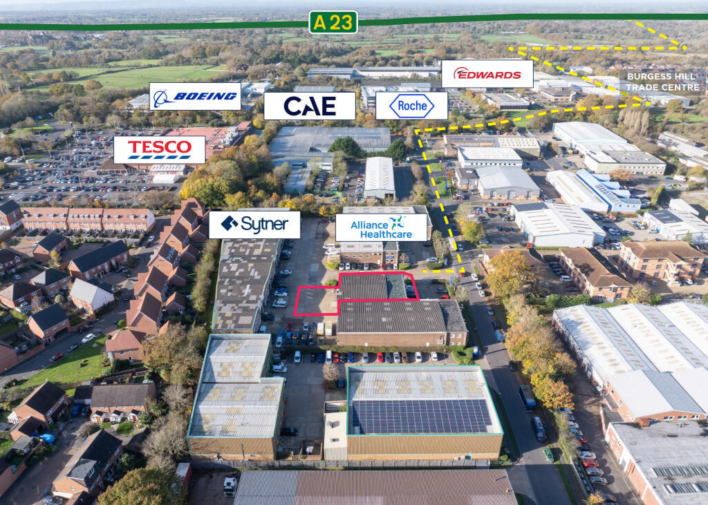 Burgess Hill is strategically located along the A23 corridor, with convenient access to the A23 via the A2300. This provides excellent connectivity northbound to London (approximately 40 miles) and Gatwick Airport (approximately 16 miles), as well as southbound to Brighton (approximately 10 miles) and the A27. The town benefits from strong rail links, offering regular services to London Victoria, Gatwick Airport, and Brighton. Victoria Industrial Estate accommodates a diverse range of prominent occupiers, including Boeing, CAE UK, Roche Diagnostics, and Royal Mail. A Tesco superstore is located within walking distance of the subject property, with additional amenities available nearby in Burgess Hill town centre.