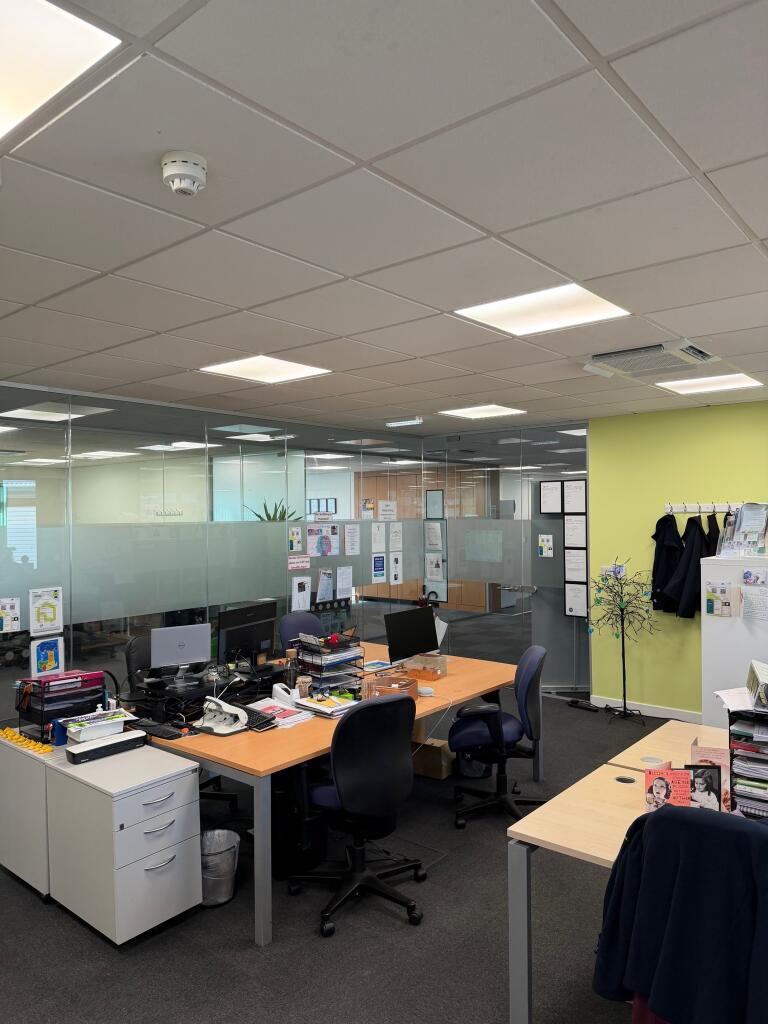 Office unit comprises main larger office, 2x smaller offices suitable for use as managers office/meeting rooms/storage room.