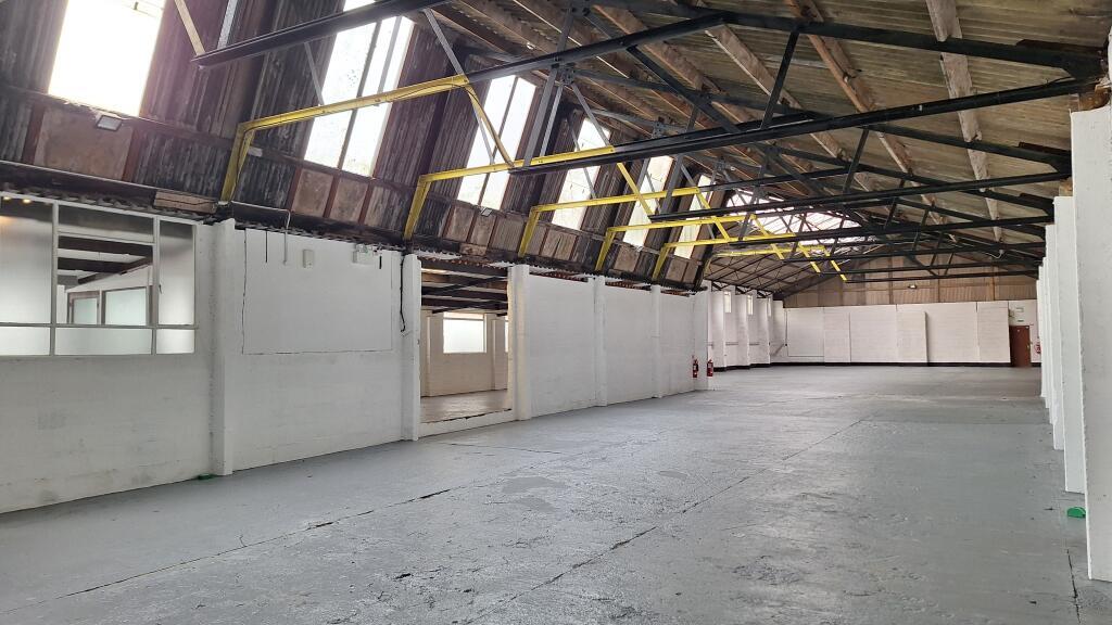 The property comprises a large, open plan warehouse/ industrial unit with a separate reception space, office, and additional enclosed storage space.