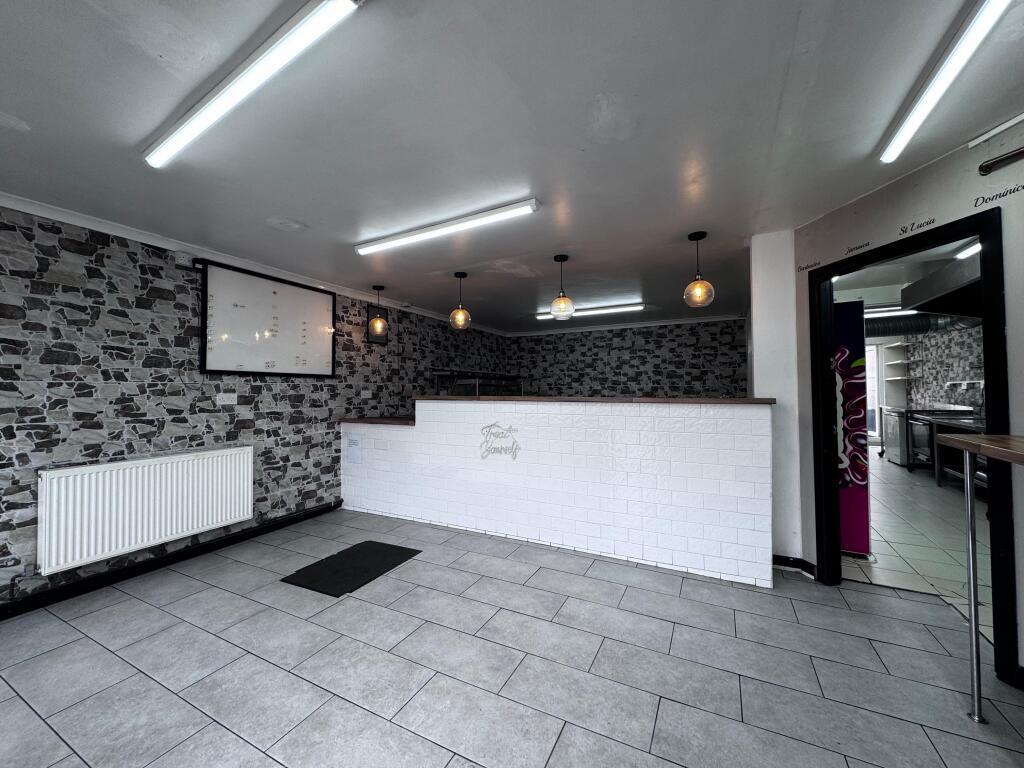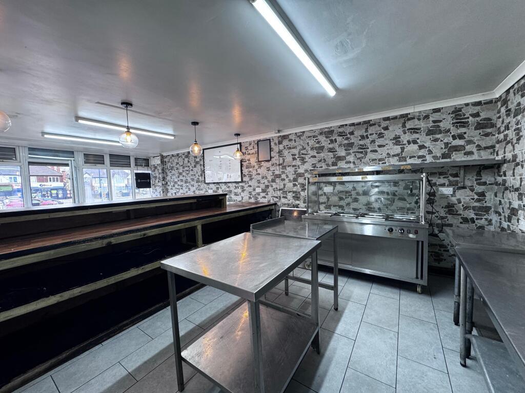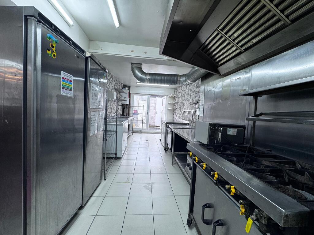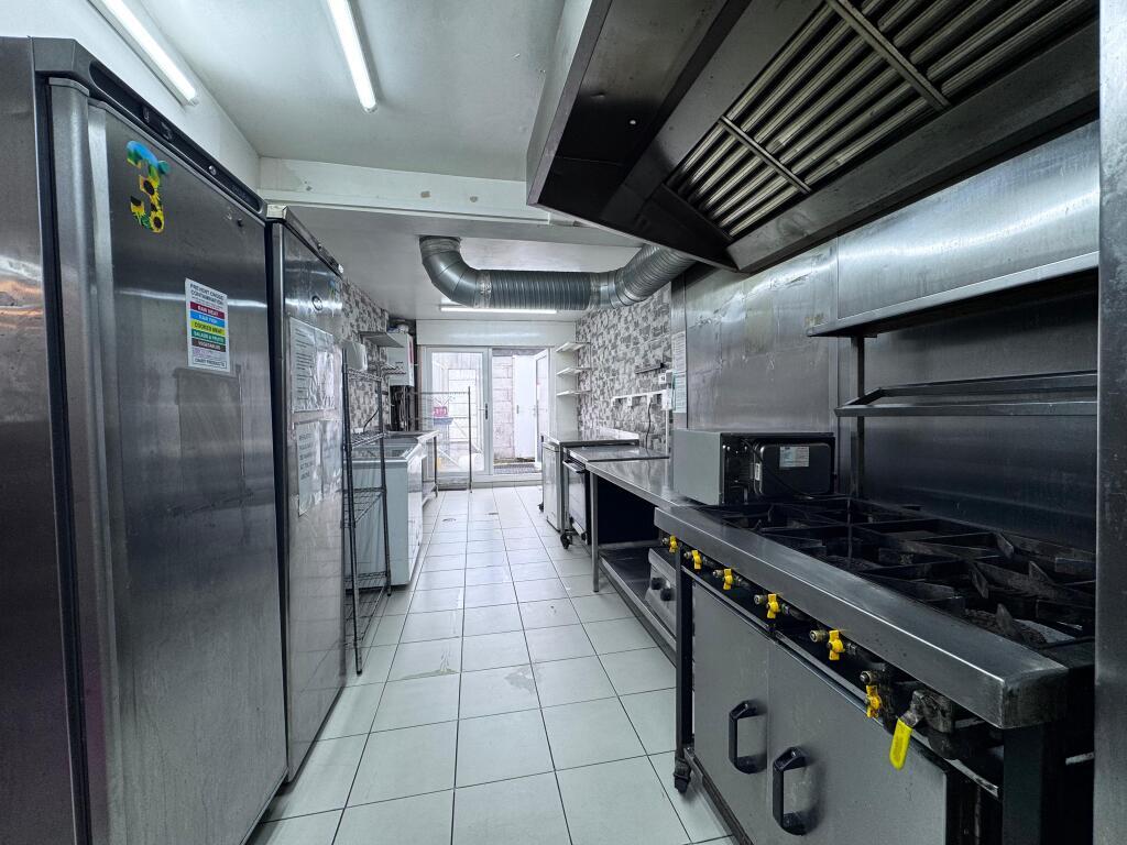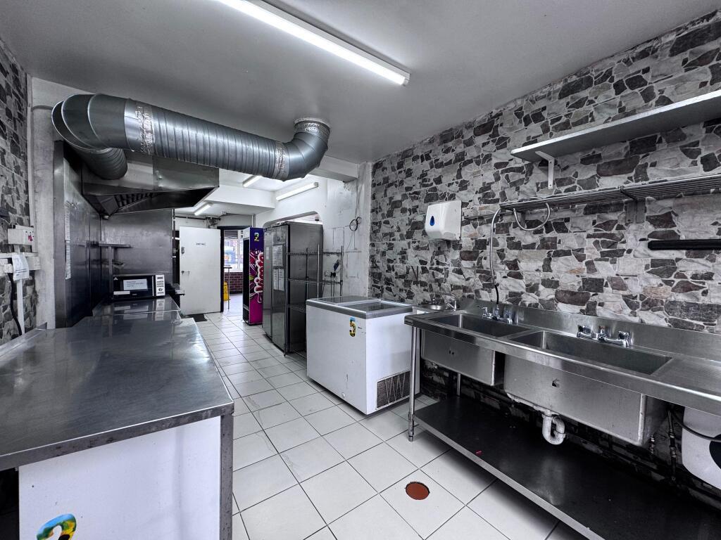 The property is arranged over the ground floor and briefly comprises a customer service area with fitted counter, spacious commercial kitchen with extraction canopy, stainless steel preparation surfaces, multiple sinks, storage areas and additional preparation space to the rear. The unit is fully equipped and suitable for a variety of food and takeaway uses, subject to the necessary consents.