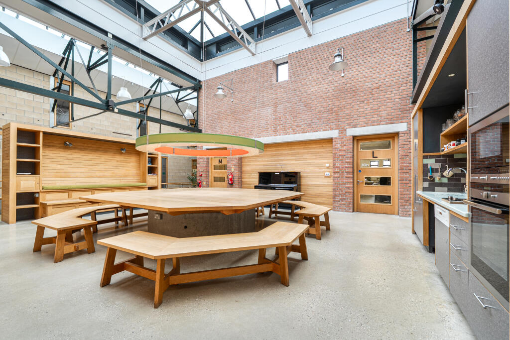 The central four-storey building accommodates 12 workshop units on the ground and first floors, with six duplex apartments above. External staircases and steel gantries provide access to the upper levels. Workshop units are self-contained, open-plan spaces incorporating kitchenette, WC and underfloor heating, with the flexibility to combine adjoining units via internal openings if required. Ventilation is provided naturally through wind cowls, eliminating the need for mechanical extraction. Heat exchangers recover up to 70% of heat loss. Heating and hot water are supplied via a 109kW wood pellet boiler, with underfloor heating throughout.
