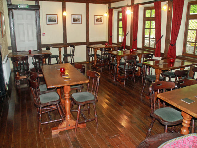 Two section LOUNGE BAR which is a very attractive area located in the oldest part of the property having heavily beamed ceiling, feature inglenook fireplace with cast iron solid fuel burner. The room is part carpeted and part wood sprung floor and has dralon upholstered fixed wall seating, dark stained Mates and Captains chairs for about 20 customers. The dining section has similar seating for 26 diners.