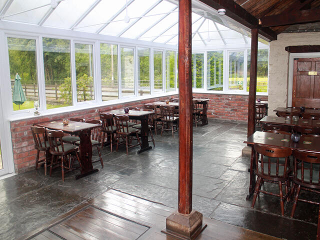 CONSERVATORY RESTAURANT/DINING ROOM having stone flag floor, dark stained Mates and tables for a total of 30 diners. There is direct access from here to the garden.