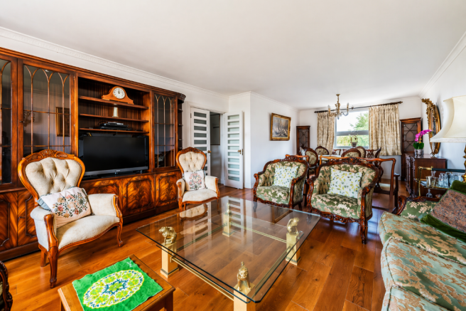 Boasting lovely views from the living room and wooden flooring throughout, the apartment offers a separate kitchen, principal bedroom with ensuite bathroom, second double bedroom, and a third smaller room ideal as a study, plus family bathroom.