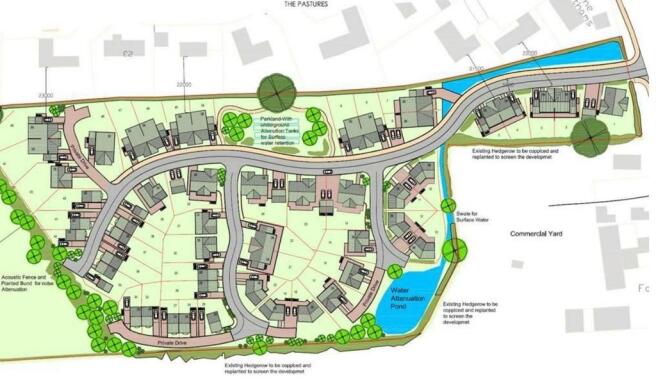 The site has outline planning consent for up to 50 units. A proposed site plan has been submitted to the planning department, providing a mixed scheme of 2 bedroom semi detached and terrace houses, 3 bedroom semi detached and detached houses and bungalows, 4 & 5 bedroom detached houses. The gross floor area of the current scheme is circa 70,000 sq.ft (700 m.sq)
