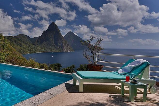 Just off the living area, five steps down is the 32-foot x 16-foot private pool. This seems almost suspended at the edge of the hillside. It enjoys views sweeping across the Soufriere Bay, Caribbean sea, and Piton mountains.