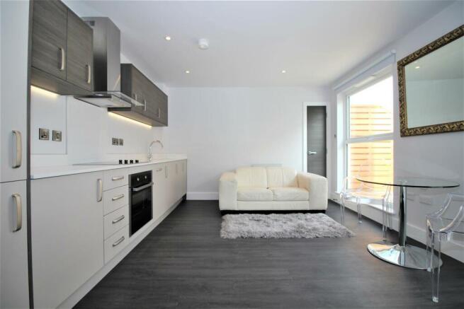 Open Plan Studio Area - Open plan living area, kitchen fitted with a range of wall and base level units, integrated appliances including washer/dryer, full height fridge/freezer, dish washer and cooker/oven.