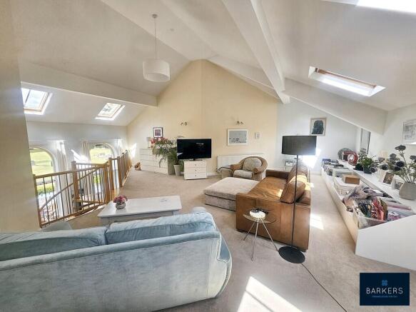 FIRST FLOOR MEZZANINE LOUNGE 29' 11" x 29' 10" (9.12m x 9.09m) This magnificent mezzanine lounge enjoys elevated views over the tranquil courtyard gardens and is bathed in natural light, thanks to four generous skylight windows. These skylights are operated via a remote control and are rain-sensitive, combining modern convenience with thoughtful design.
