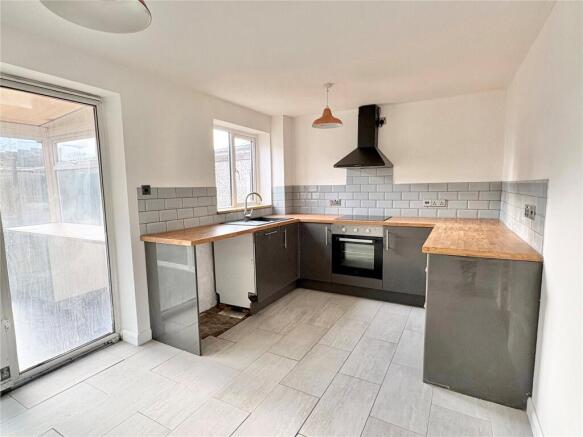 A range of base and drawer units with work surfaces inset sink drainer. UPVC double glazed window to the rear, patio doors to the conservatory and radiator.