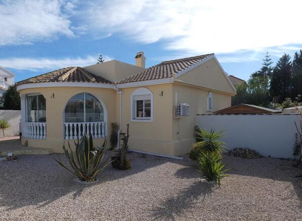 Pedestrian access is via a single, ornamental metal gate, which opens onto a paved path. To the right is the front garden, which is laid to shale and thoughtfully planted with a selection of vibrant flowering shrubs, succulents and yuccas. The villa is located directly in front where low-level steps with decorative balustrade and handrail lead to the front terrace.
