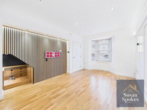 Lounge - 2.89 x 4.5 (9'5" x 14'9") - A light and airy lounge beautifully presented with engineered oak wood flooring and a stylish feature panel wall. The room benefits from a bespoke media wall with integrated fittings, including wiring for a home cinema system and built-in surround sound. Enhanced by LED strip and wall lighting, a twin panel radiator, and a useful understairs area. A uPVC sash-style double-glazed bay window with fitted Venetian blinds allows for excellent natural light while maintaining privacy.
