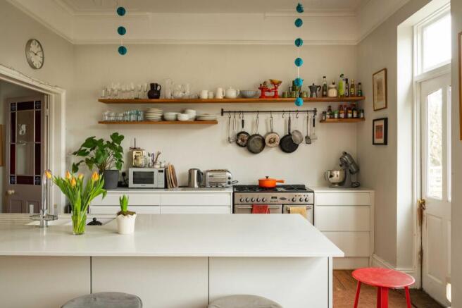 The reception room at the front features double-glazed twin-sash windows, an ornate ceiling rose and cornice, a gas fire with a marble surround, built-in cabinetry, and exposed wooden floorboards. The kitchen/diner to the rear has two double-glazed sash windows and a double-glazed door, overlooking the rear garden and leading onto a decked terrace seating area. The modern white kitchen contrasts beautifully with the retained period features and offers ample storage, a large breakfast bar, space for a range cooker, and shelving. The dining area retains ornate coving, a ceiling rose, a period fireplace, and original cabinetry.