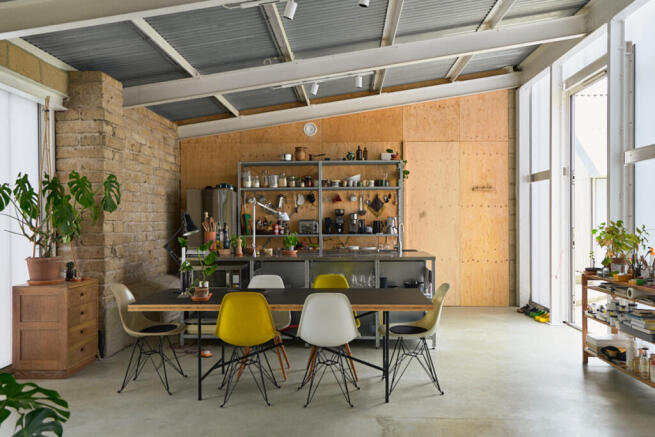 The interior layout is clearly defined, with living and cooking zones divided by a central dining table. Underfoot, polished concrete flows throughout, complementing the utilitarian stainless-steel kitchen island, with integrated Miele appliances. Exposed shelving draws the eye upward to the vaulted ceiling and pared-back ply wall. Behind the kitchen, a large door leads to a practical zone comprising a W/C, pantry, and the primary entrance that has ample room for coats and bags.