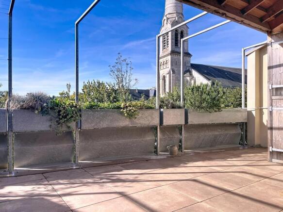 On the top floor, the living room comes into its own. Light floods through the spacious open-plan kitchen, extended by a terrace overlooking the city rooftops and framing a historic building in the foreground.