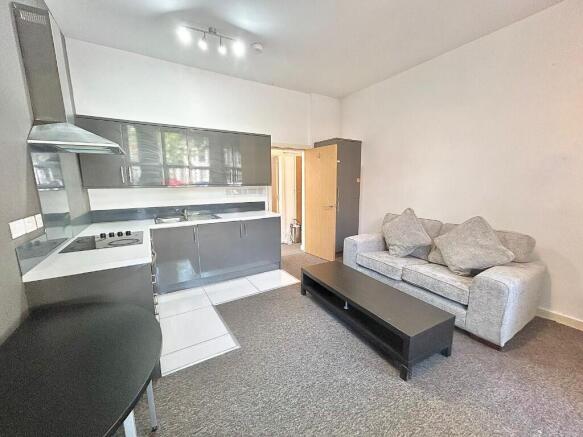 The modern apartment benefits from an open plan kitchen lounge; the living area has a huge bay window allowing a great deal of natural lighting into the room and comes fully furnished matching furniture throughout such as a two-seater sofa, coffee table, desk, and chair. The stylish grey kitchen has all essential appliances such as an integrated fridge freezer, washer dryer 2-in-1, modern oven, and hob!