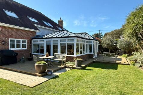 A substantial four bedroom, three bathroom, for reception attached clifftop home, superbly situated with first floor living accommodation and large sun balcony with coastal views towards both the Isle of Wight and Christchurch Bay in the west, double garage and landscaped garden